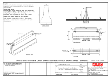 Reinforced C28/35 concrete barriers (New Jersey shape), double-sided measuring 2000mm x 400mm x 600mm (L X B X H) for use as a free standing and permanent system without any backing.